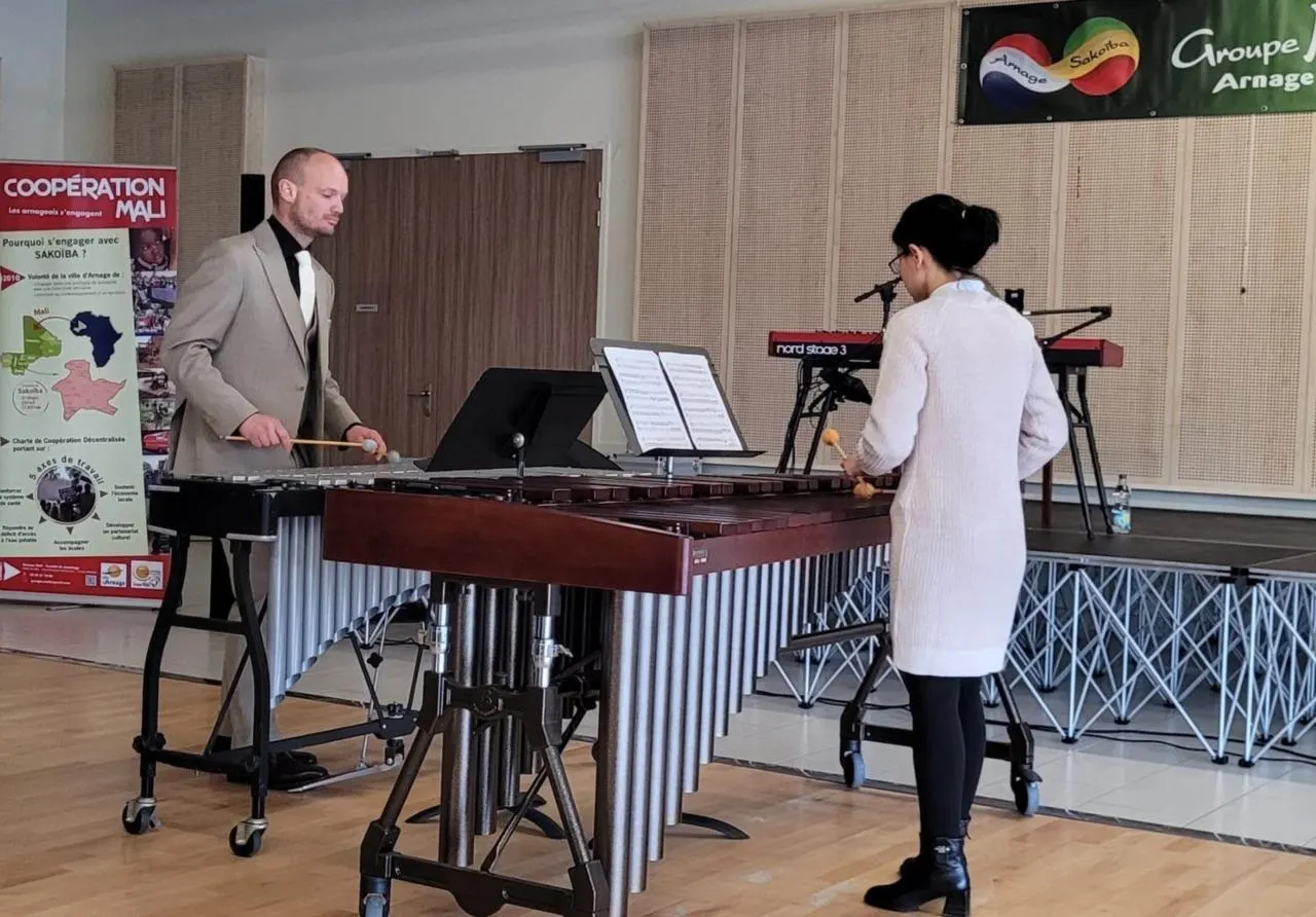 Fabien Tisserand professeur à l’EEA Django-Reinhardt d’Arnage et Gäo Zhènyi, ont livré une belle prestation aux percussions. © Le Maine Libre