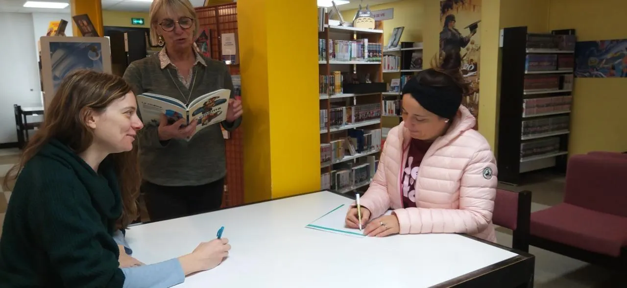 Alexandra Goubin (responsable à la médiathèque) et Amélie testent la dictée sous la direction d’Evelyne Foubert. © Ouest-France