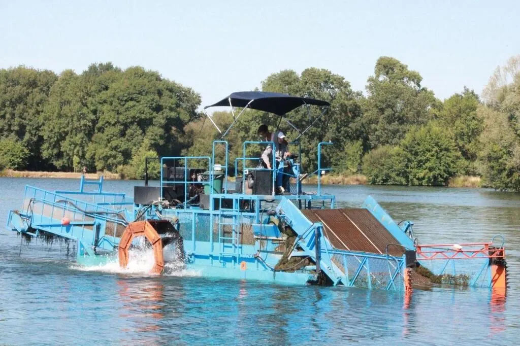 Le bateau faucardeur travaillait chaque jour, de 6 h à 22 h, sur le lac de la Gèmerie. © Ouest-France