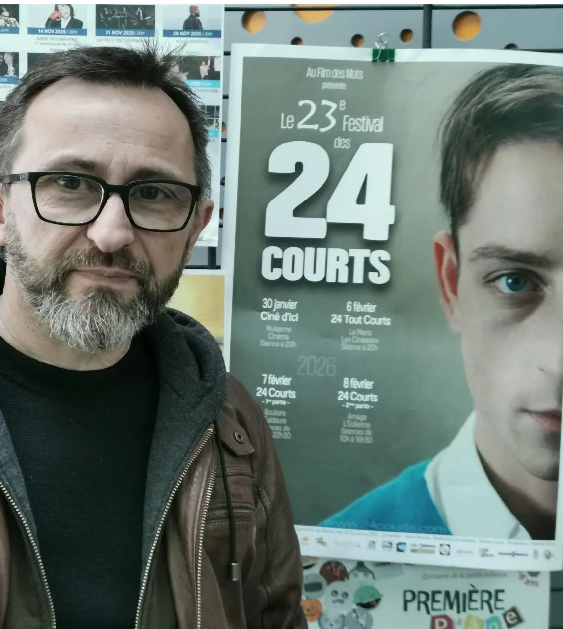 Claude Saussereau, coprésident fondateur du festival, devant l’affiche de la 23e édition, réalisée Par Christophe Pinto, d’après le film lauréat l’an dernier, Wesh Rimbaud, de Dimitri Lucas. © Le Maine Libre