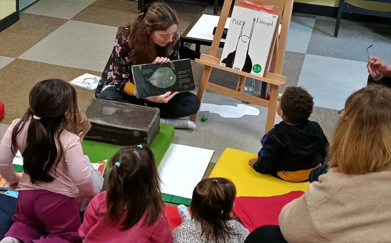 note-t-elle. Effectivement, treize enfants et huit adultes au total sont venus de la micro crèche Les Lilas située à deux pas, ainsi que deux assistantes maternelles et deux familles. Alexandra dévoile le contenu de la séance :  J’ai fait sur le thème : Petites et grandes bestioles. Un petit escargot et ses amis nous ont accompagnés pendant les lectures, avec la comptine qui va avec (en musique, en livre et en jeu de doigt). On a lu ainsi les livres Petit escargot, de Thierry Dedieu, Bonjour bestioles, d’Amandine Piu, Mia, de Benji Davies, Madame Cocotte, d’Édouard Manceau, Petit, de Maria Jalibert et Cécile Bonbon, Le plus grand d’Anne Crahay, Bébert l’escargot, de Jean-François Dumont, j’ai observé que le livre Madame Cocotte a très bien marché auprès des enfants, j’avais prévu une petite activité à côté.Â
