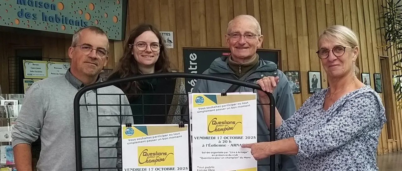 Denis Oualet (conseiller municipal), Alexandra Goubin (responsable de la médiathèque), Jean-Paul Barcy (joueur) et Évelyne Joubert (bénévole à Lire à Arnage) ont présenté la soirée de « Questions pour un champion ». © Ouest-France