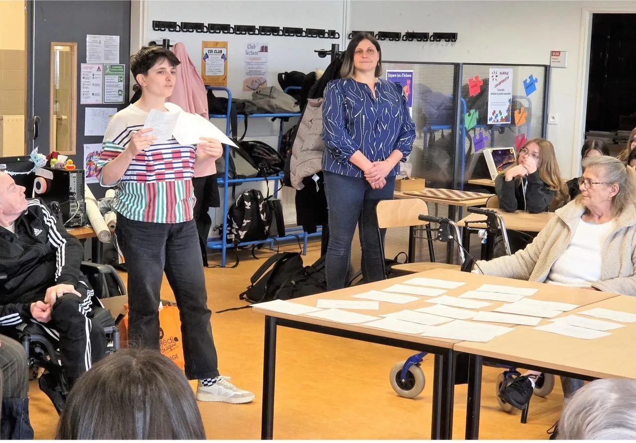 Élèves et personnes âgées ont partagé un bon moment de complicité créative et de convivialité avec l’autrice Ariane Hugues. © Le Maine Libre.