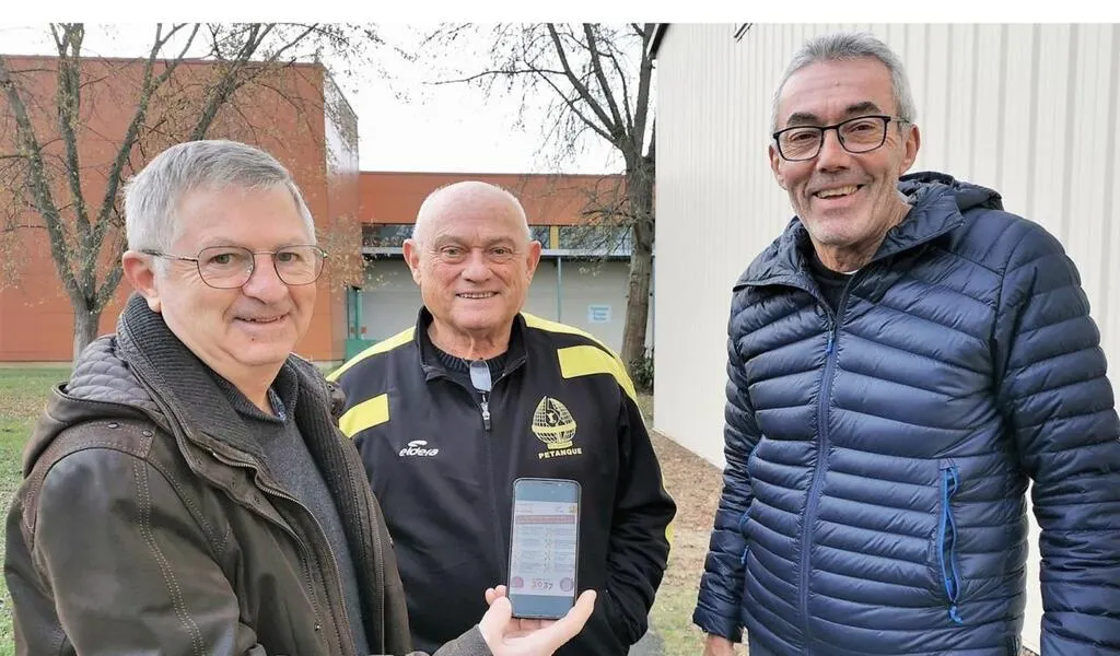 Jean-Pierre Gauthier, président de l’Omnisports d’Arnage, aux côtés de Jacky Bobet, de la section pétanque et Philippe Jérôme, président de la section athlétisme, présente sur son portable le flyer listant les actions. © Le Maine Libre
