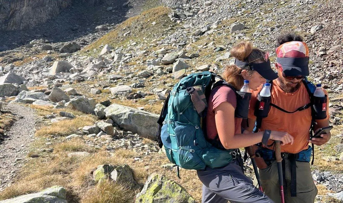 Suzel et Matéo en pleine montagne, leurs sacs à dos contenant entre 12 et 20 kg de charge. © Par Monts et Par Soi.