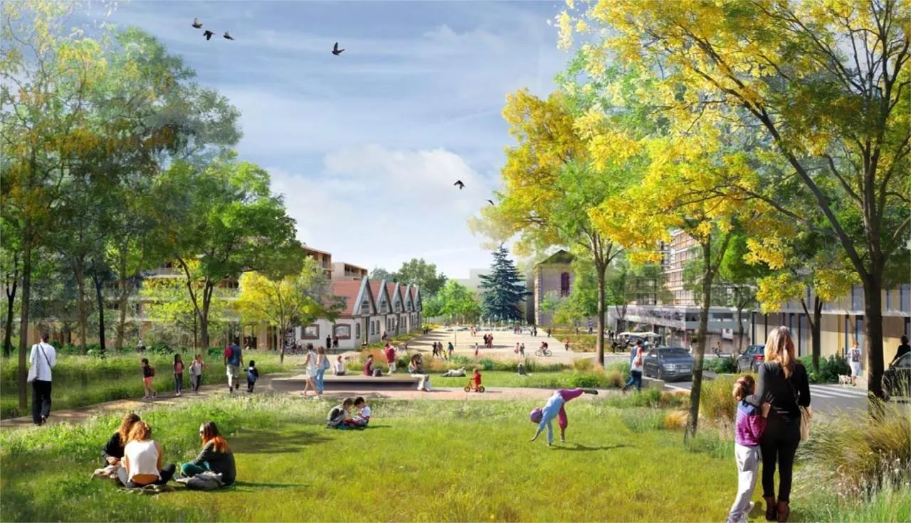 Le futur quartier Arsenal-Marais sera coupé par une longue travée végétalisée dotée d’une grande place. © Illustration Le Mans Métropole
