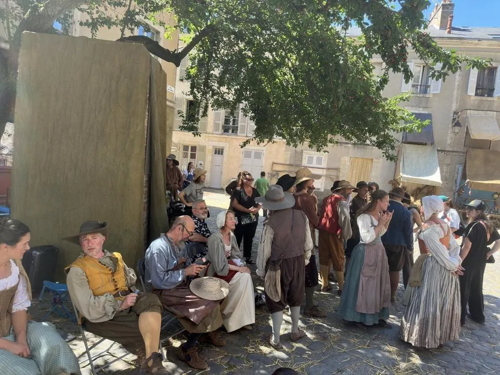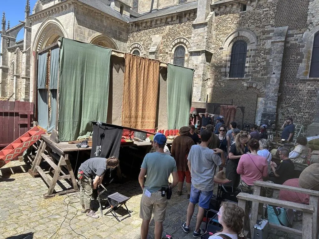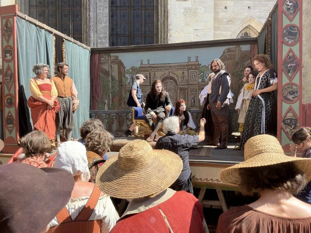Un petit théâtre de fortune, à la Molière, est installé ce mardi 24 juin 2025 au pied de la colossale cathédrale du Mans (Sarthe) dans la cité Plantagenêt. Sur ses planches ...
