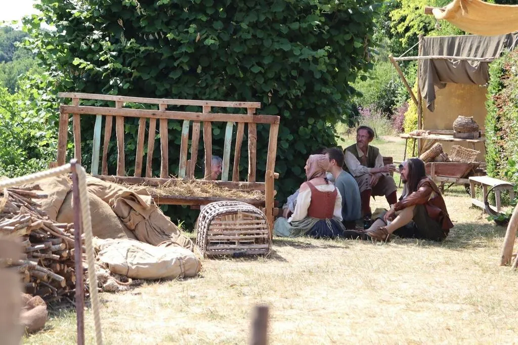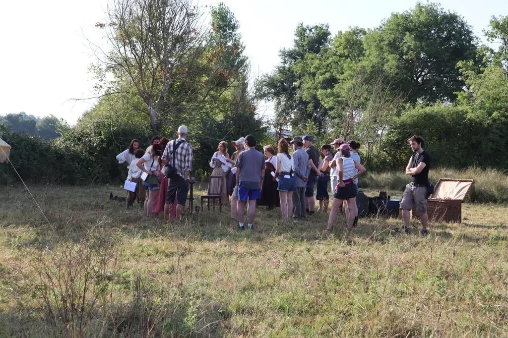 Réunis autour d’Artus, de Nemo Schiffman et de Julia Piaton, les acteurs et figurants du film « Les caprices de l’Enfant Roi » s’apprêtent à tourner une scène aux abords de la frayère de Parcé-sur-Sarthe. © Ouest-France