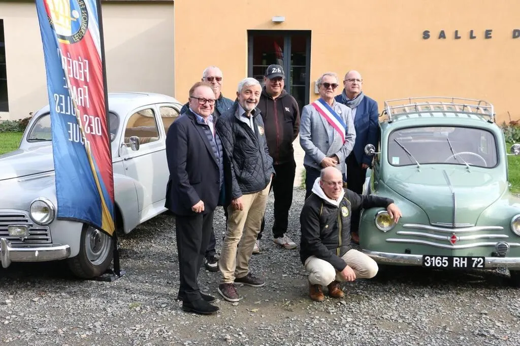 Samedi 12 octobre 2024, le maire d’Asnières-sur-Vègre (Sarthe) et les collectionneurs de vieilles voitures ont officialisé la remise du label, qui doit renforcer l’attractivité touristique du village. © Ouest-France