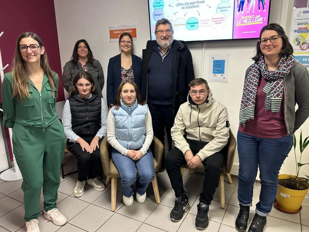 Les trois jeunes, ici entourés de leurs conseillères, de Marie-Élize Tilly, sous-préfète, et de Michel Langlois, président de la Mission locale Sarthe et Loir. © Le Maine Libre