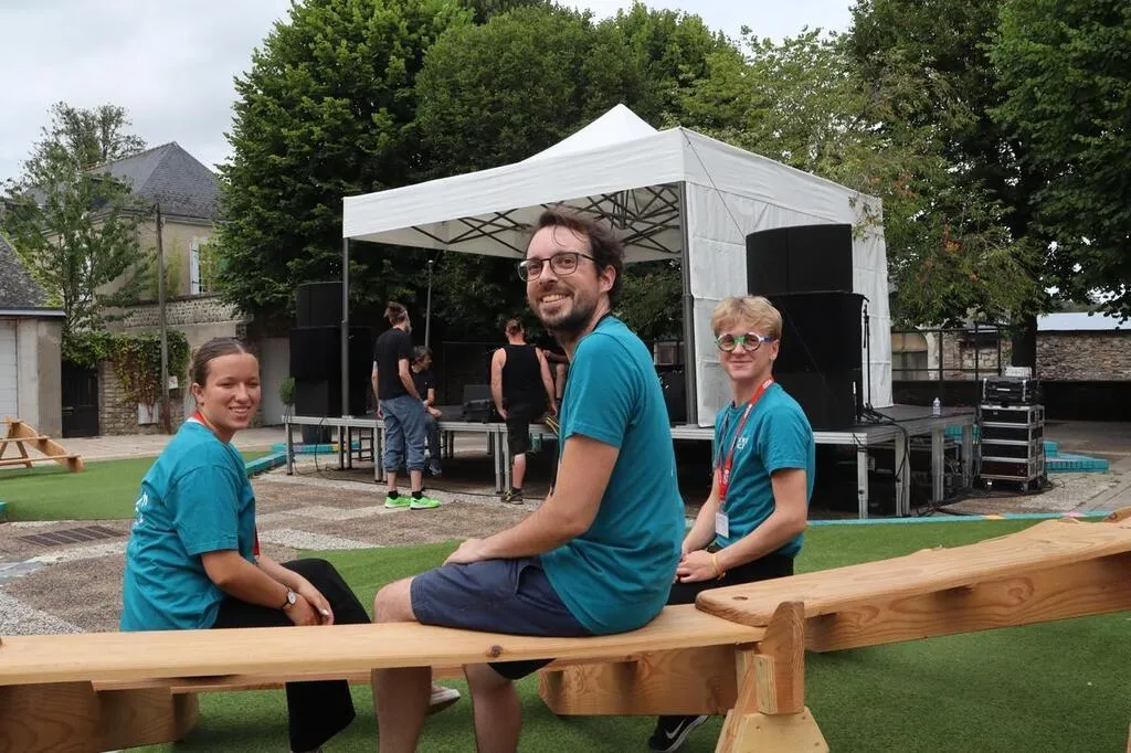 Antoine Perrotel, entouré par Margaux Dubois et Hector Court, officie comme attaché de production sur la 46e édition du festival de Sablé-sur-Sarthe qui s’achèvera samedi 24 août 2024. © Ouest-France