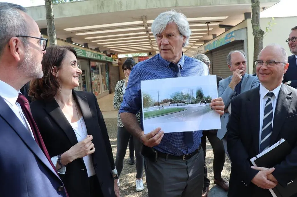 Le maire du Mans (Sarthe) Stéphane Le Foll a présenté une esquisse du futur centre commercial de l’Épau, à Anne-Claire Mialot, la directrice de l’Anru, Stanislas Bourron, directeur de l’ANCT, et Emmanuel Aubry, le préfet de la Sarthe. © Ouest-France