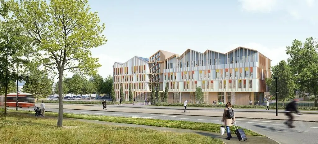 Une vue d’architecte du bâtiment dédié à la formation théorique, du futur centre national de formation de la SNCF, au Mans. Ici, depuis le boulevard Demorieux. © A+ Architecture