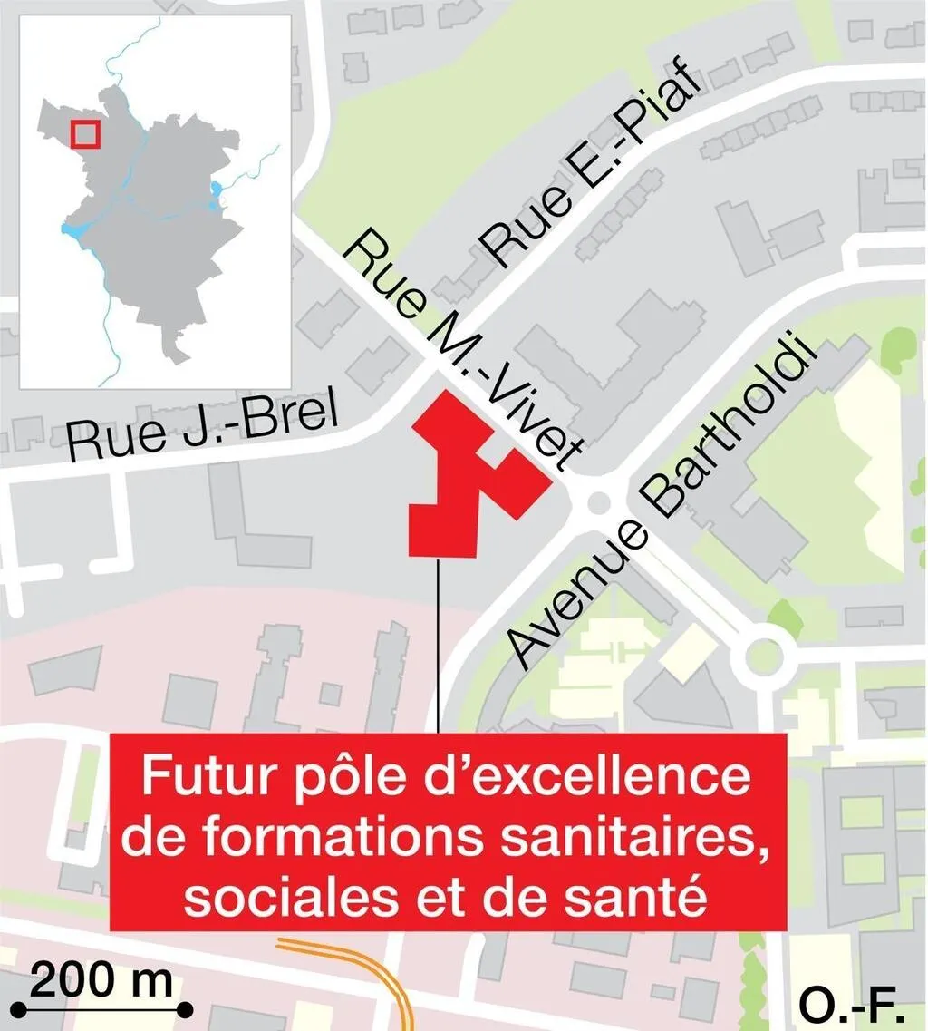 Le futur pôle d’excellence va s’élever à l’angle de l’avenue Bartholdi et de la rue Martial-Vivet. Juste en face de la résidence étudiante Bartholdi d’un côté, et de la résidence seniors Domitys de l’autre. Ouest-France