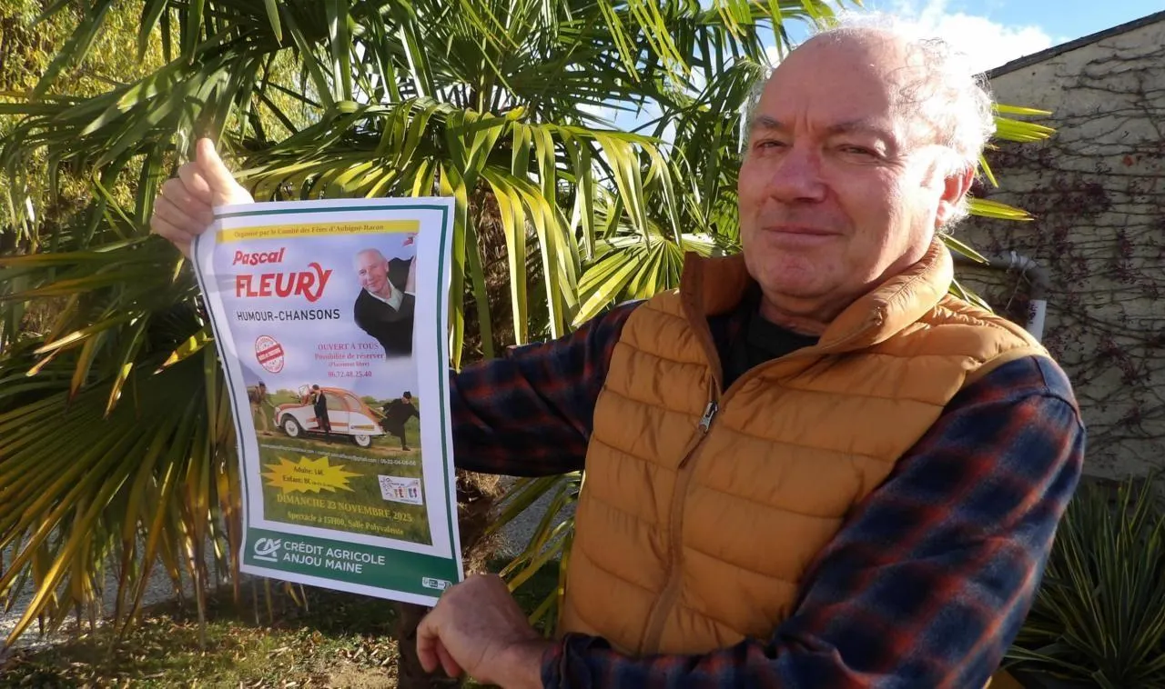 Michel Dian, le président du comité des fêtes, avec l’affiche du spectacle de Pascal Fleury. © Le Maine Libre