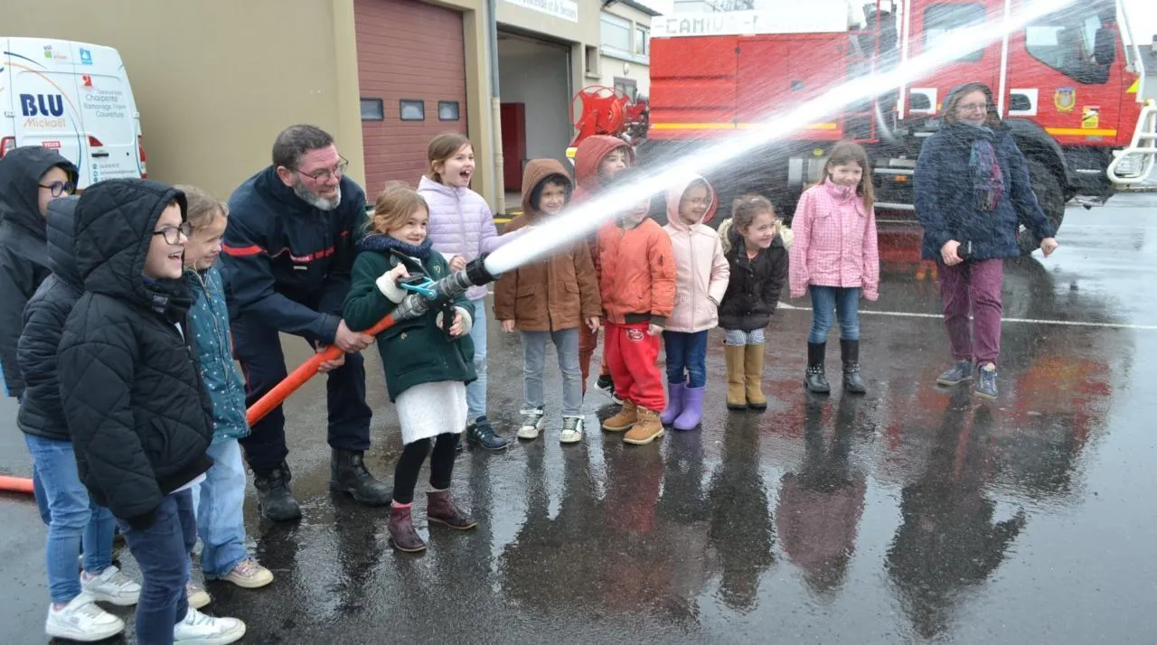 Devant le centre de secours, situé à proximité de la salle des fêtes, trois véhicules d’intervention les attendaient. Mickaël Blu, chef du centre, et quelques pompiers volontaires en uniforme ont accueilli les enfants de grande section et CP d’Élisabeth Houdouin.