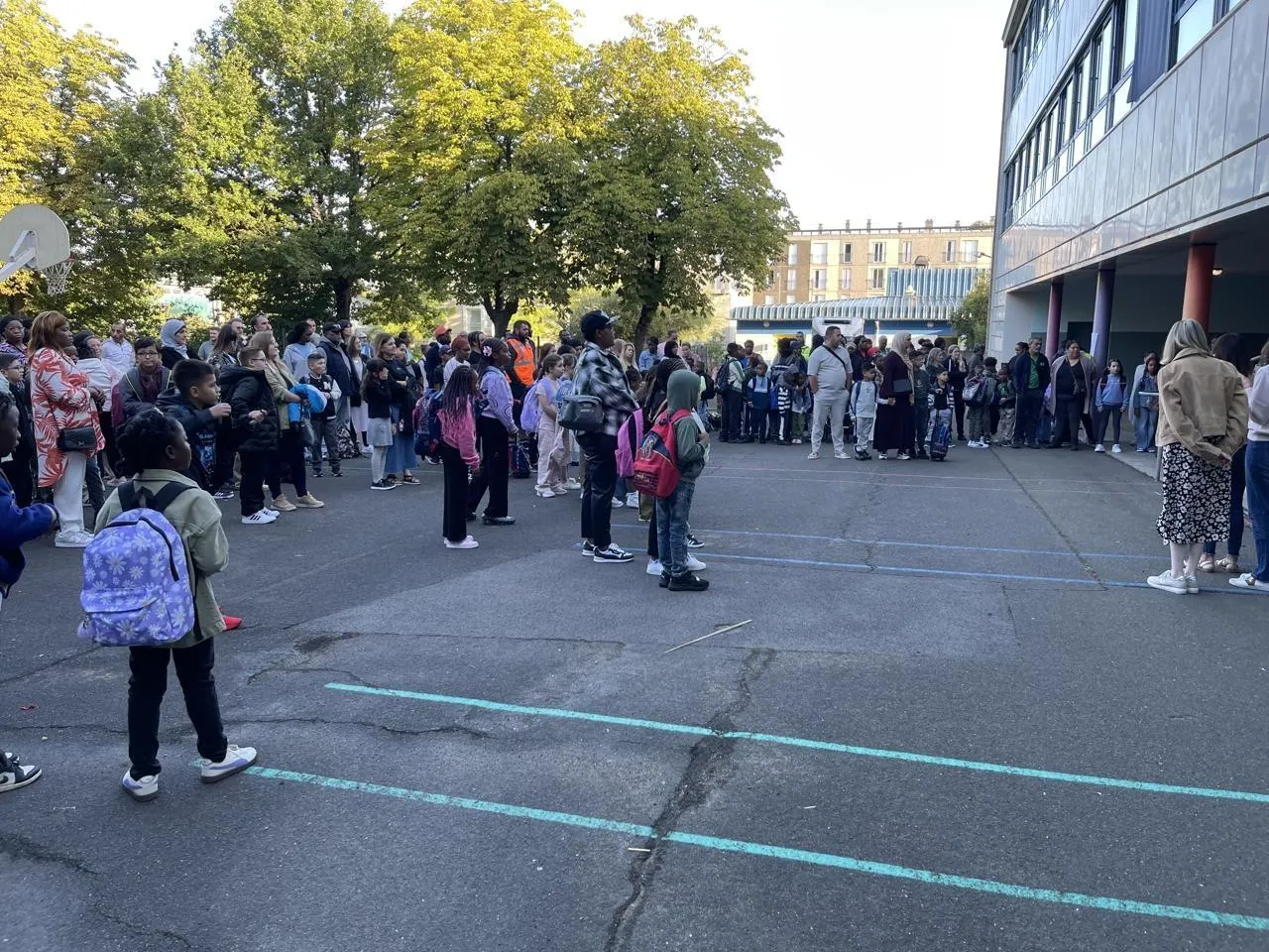 Enfants et parents rassemblés devant l’école Victor-Hugo. © Le Maine Libre