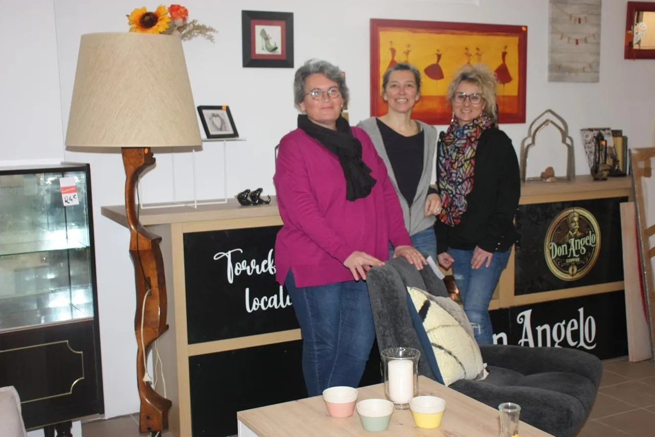 Nathalie Grasset, directrice d’Atima, Stéphanie Jacono, responsable de la boutique Fripes et troc du May-sur-Èvre, et l’une des trois personnes en insertion employées. © Ouest-France