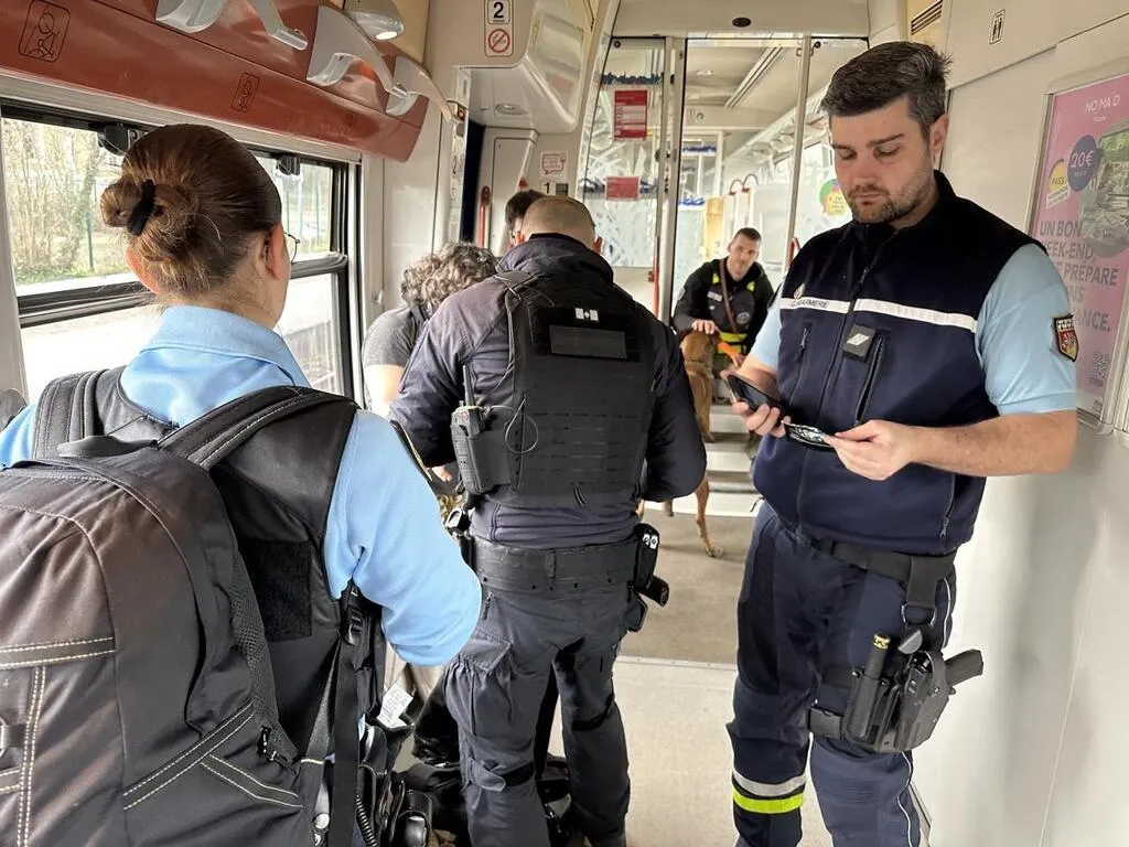 Comme ici dans le TER Le Mans-Tours, la gendarmerie sarthoise a voulu « montrer du bleu » pour effectuer des contrôles et « rassurer la population », à l’occasion de l’opération « place nette » qui vient d’avoir lieu durant trois jours sur tout le département. © Ouest-France