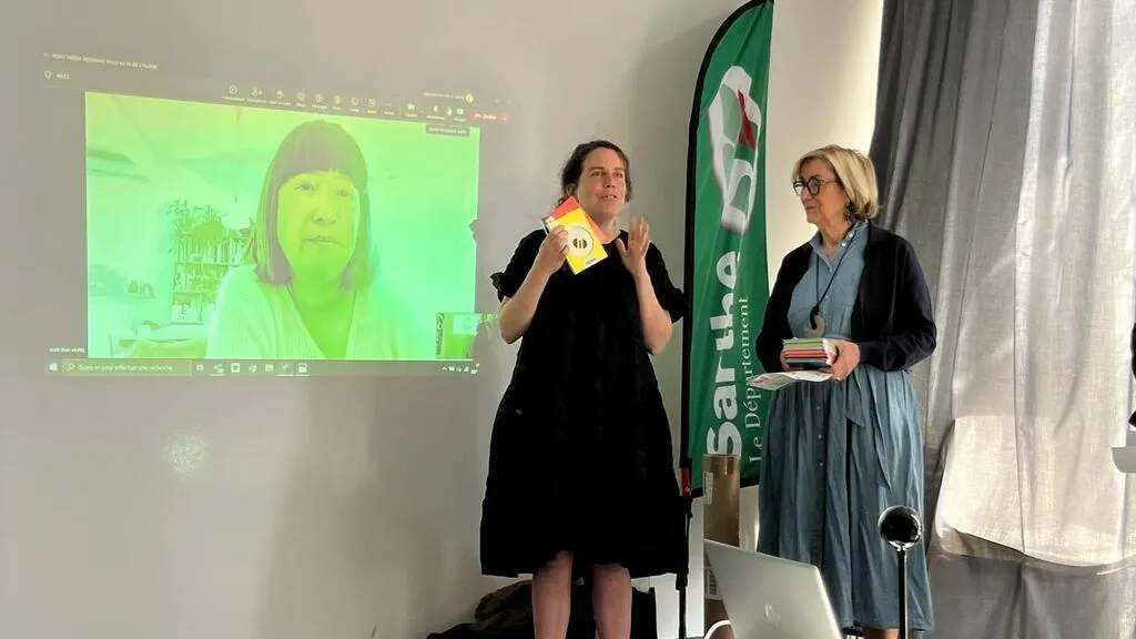 Alice Brière-Haquet, autrice pour la jeunesse, présente sa collection d’albums « Philomino » en visio avec Mai Li Bernard, dessinatrice, avec Véronique Rivron, conseillère départementale (à droite). © Ouest-France
