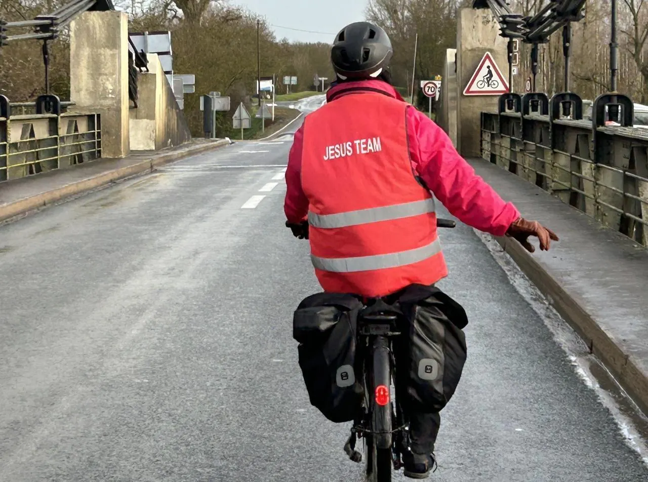 Avec son gilet rose et « Jésus team » dans le dos, Laurent est connu comme « le prêtre à vélo »... |