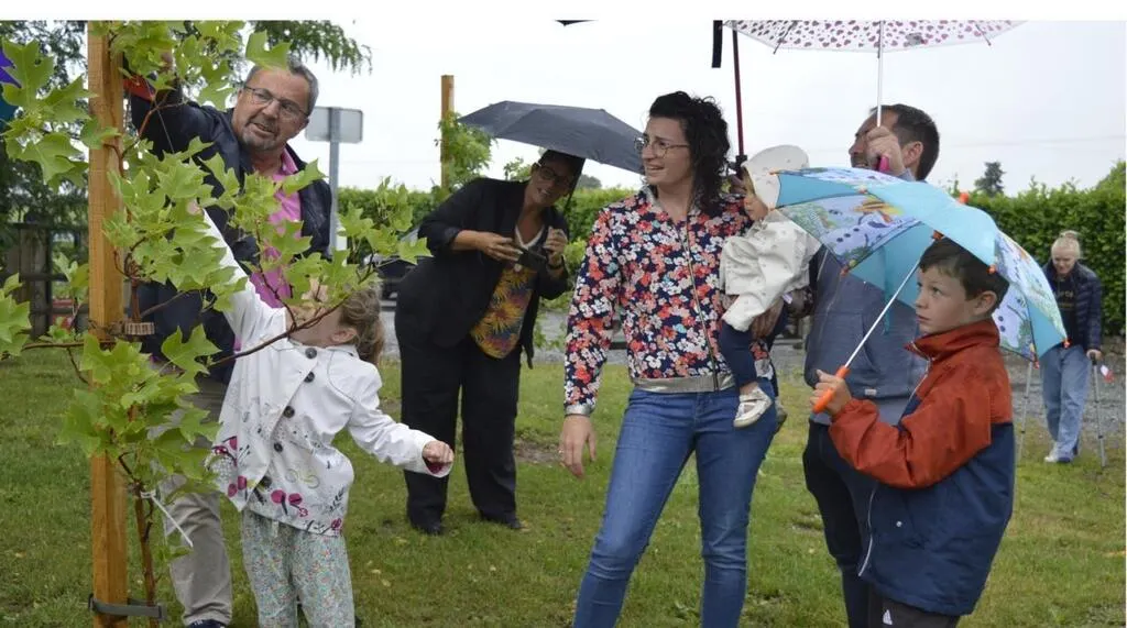 Sous la pluie, trois élus ont fait découvrir aux parents les arbres portant dorénavant le prénom de leur enfant. © Le Maine Libre