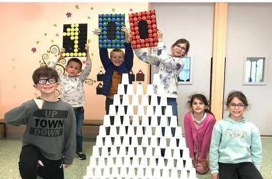 Des ateliers de construction, de cuisine, de sport… Les écoliers ont pu construire une tour avec 100 gobelets (travail de collaboration et patience), préparer 100 salades de fruits (découpe, épluchage), se dépasser sportivement (100 squats, 100 tours de cour, 100 passes…), trouver 100 mots en lien avec la cuisine (fruits, légumes, ustensiles, vocabulaire), réaliser 100 avions en papiers (pliages, précision). Tous les enfants ont participé aux ateliers.