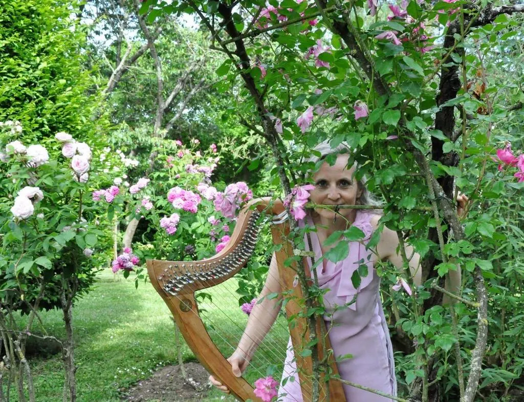 Sylvie Callu accompagnée de sa harpe celtique dans un décor bucolique. © Sylvie Callu