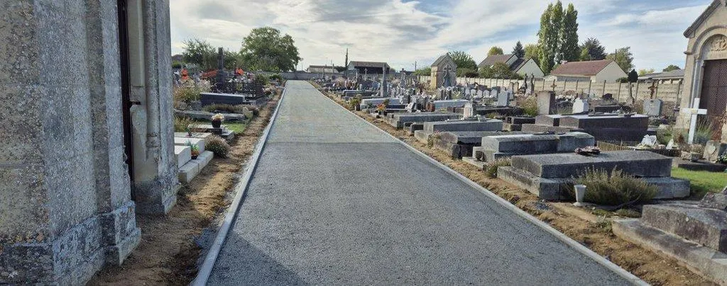 La commune a lancé des travaux dans les allées des deux cimetières. Après plusieurs semaines de chantier, une étape importante vient d’être franchie : la pose de l’enrobé. Les allées seront désormais praticables et confortables. © Ouest-France