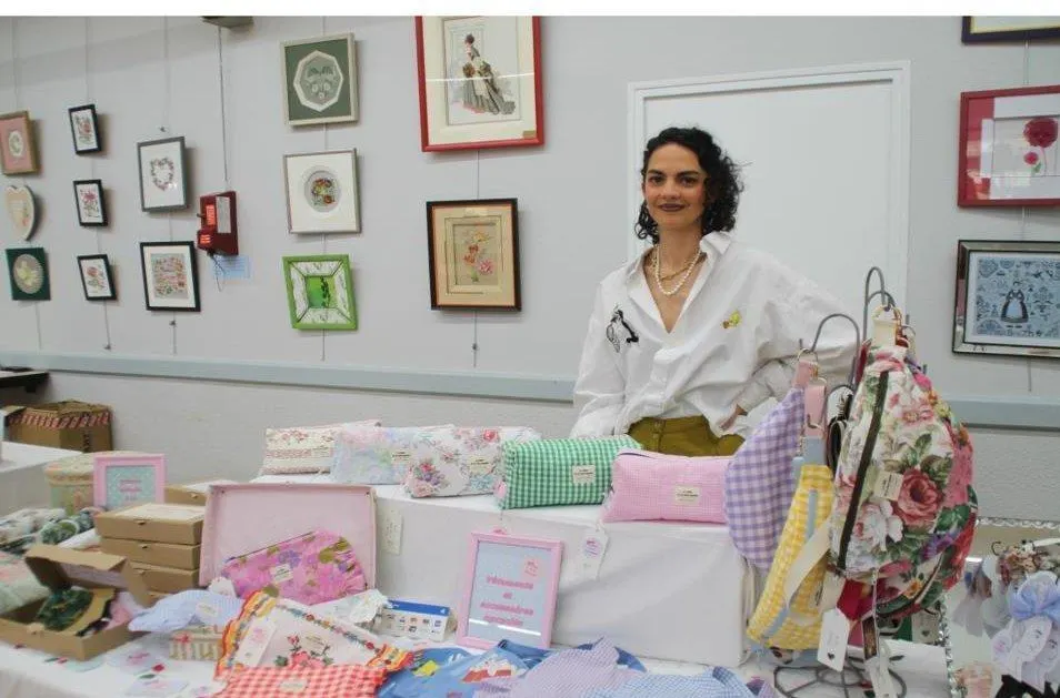 Camille derrière son exposition de broderie. © Le Maine Libre