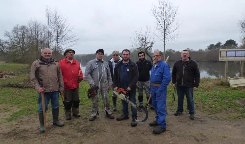 Samedi matin, quelques membres de la société de pêche se sont retrouvés pour commencer le nettoyage des berges du plan d’eau du Creux, préalable à un aménagement total du lieu. © Ouest-France