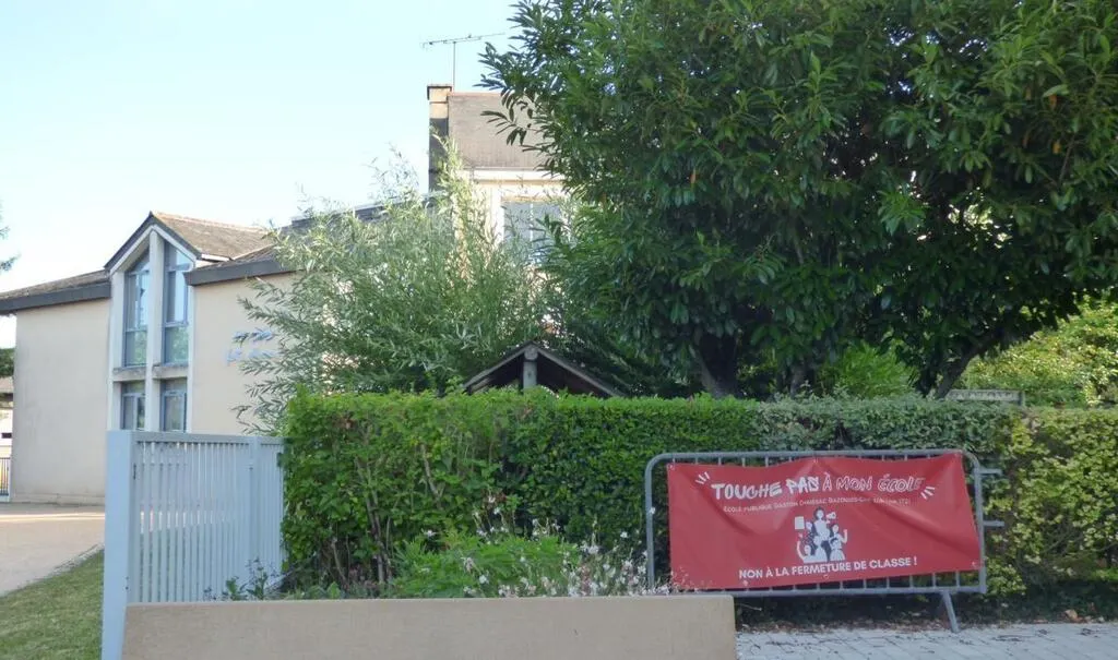 La banderole, souvenir de la mobilisation contre la fermeture de classe est encore là , mais l’annulation de la fermeture a été officialisée par l’inspection académique. © Ouest-France