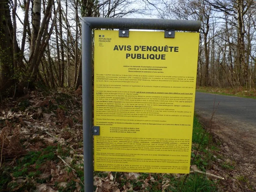 Jusqu’au 8 avril 2024, une enquête publique est ouverte à Bazouges – Cré-sur-Loir, près de La Flèche (Sarthe). Elle concerne la carrière d’extraction d’argile qui veut augmenter sa capacité maximale d’extraction annuelle de 50 000 à 62 500 tonnes et augmenter sa surface d’exploitation.