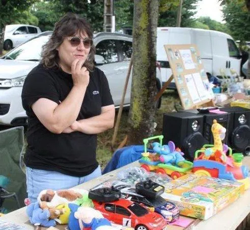Parmi les exposants, Sylvie, une bénévole d’Art et Culture, avait choisi de passer de l’autre côté de la barrière.  Les enfants sont adultes, il est temps de se séparer des jouets, jeux et autres petites affaires qui feront des heureux. Moi, je suis là surtout pour faire du vide chez moi et en même temps aider à combler les défections d’exposants. Mon mari est occupé à faire la circulation au parking, les enfants préparent une autre tournée de jouets, c’est pratique d’habiter juste à côté du terrain !Â