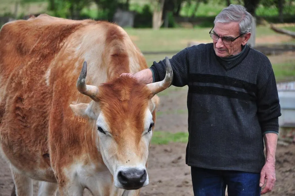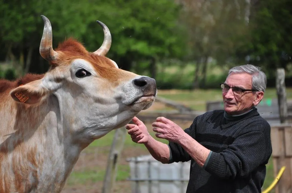Joël Mahé, ici avec Mistral, un bÅ“uf jersiais, attend les visiteurs dimanche au refuge animalier des Crins verts. © Le Maine Libre