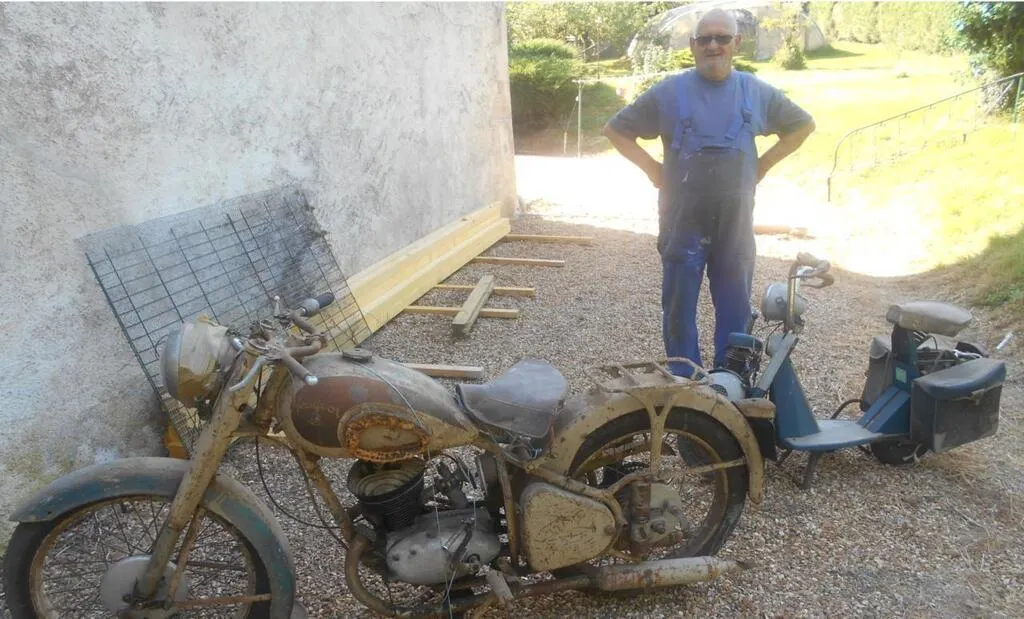 Et il le fait dans une véritable caverne d’Ali Baba. Dans ses ateliers de fortune remplis de reliques du patrimoine mécanique, ça sent l’huile, la graisse, le vieux. Jacky présente une moto de marque Peugeot de 175 cc de 1954, sur laquelle il y a pas mal de travail à faire. « J’ai récupéré cette moto lors d’un déménagement. Elle fonctionne. Vous remarquez qu’elle a la chaîne à droite, des freins à tambour. Elle est dans son jus », témoigne le bricoleur.