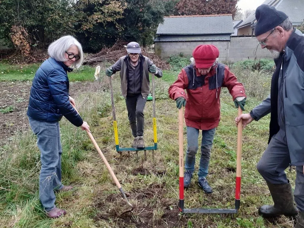 Situé dans les jardins familiaux, derrière le centre social Georges-Rouault, cet atelier-potager est porté par Familles rurales. Samedi 9 novembre 2024, ils étaient sept à se retrouver pour désherber, ameublir, émietter la terre de leur nouvelle parcelle. Pas de motoculteur, mais deux grelinettes, sorte de grandes fourches à deux manches et cinq dents.  Elles permettent d’aérer la terre sans la retourner et de conserver la partie superficielle qui est la plus fertile.Â
