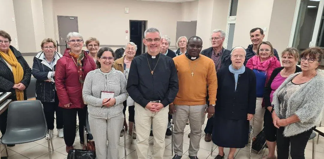 Le père Emmanuel Jamin et le père Alain Foti, entourés de paroissiens pour préparer la rentrée pastorale. © ensemble paroissial