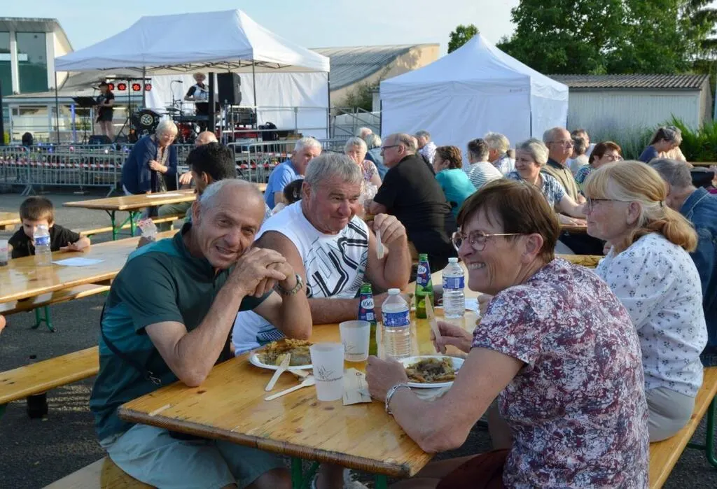 Au centre de la place, de grandes tablées ont été mises à la disposition du public par les bénévoles de l’association. La soirée dînatoire dansante s’adressait au plus grand nombre grâce aux musiciens et chanteurs de l’Orchestre Éclipse, dont le répertoire est intergénérationnel. Le groupe a fait danser le public jusque tard dans la nuit.