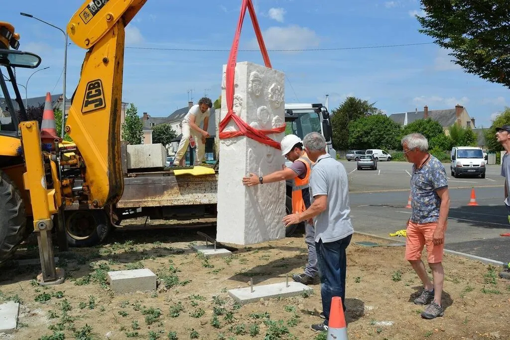 Le positionnement de la première statue sur un socle en béton, préparé par les services techniques de Bessé-sur-Braye, mardi 21 juin. © Ouest-France
