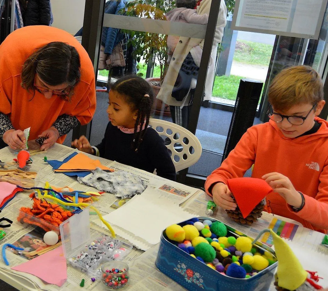 L’an dernier, un gnome fabriqué à l’aide d’une pomme de pin ramassée dans les bois, un lutin et une tête de renne créée avec des bâtonnets de glace et des cure-pipes avaient ainsi pris forme sous les doigts des petits artistes en herbes. Laine rouge, carton, feutrine, bout de ficelle, tout provient de matériaux de récupération, généralement donnés par les bénévoles. Les enfants pourront ensuite  déposer leurs créations dans le sapin de Noël de la médiathèqueÂ