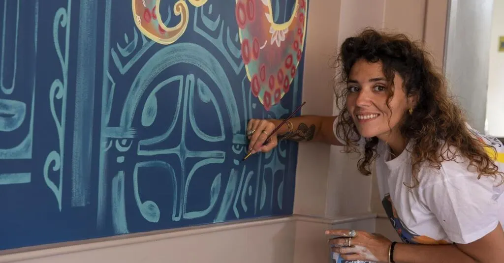 Océane Fouet artiste peintre polynésienne peint une fresque au restaurant la gare. © Le Maine Libre