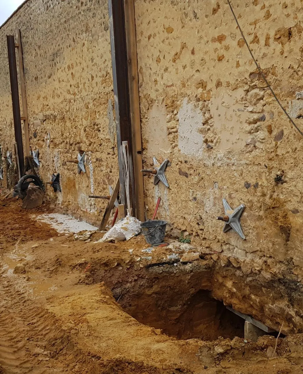 Le mur en cours de travaux, avec renforcement des fondations et installation des tirants pour assurer sa stabilité. © Le Maine Libre
