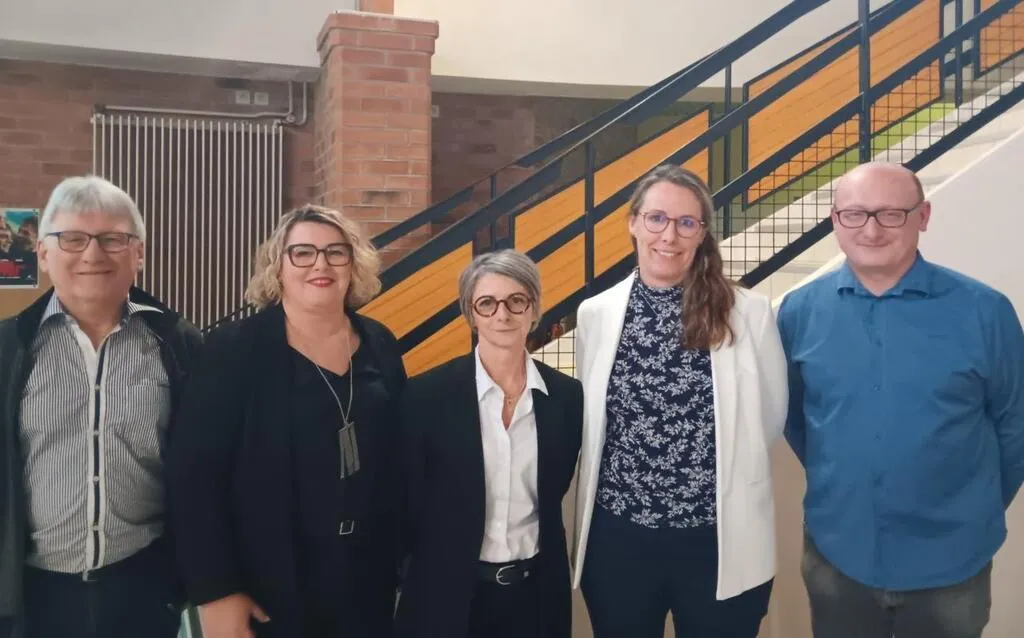 De gauche à droite : Didier Gosnet, Agnès Foubert, Catherine Daluzeau (directrice de trois agences), Marie-Pascale Richard et Thierry Lebert, nouveau président de la Caisse locale. © Le Maine Libre