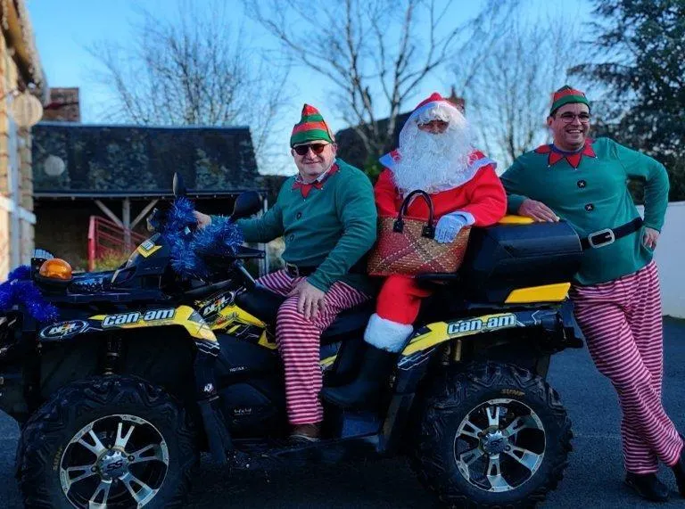 Arrivée festive en quad pour le père Noël, accompagné de deux lutins. © Le Maine Libre