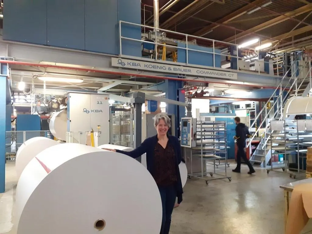 Virginie Hamm Boulard, directrice de l’usine Brodard et Taupin à La Flèche, devant la rotative KBA, qui imprime 100 000 livres de poche chaque jour. © Le Maine Libre