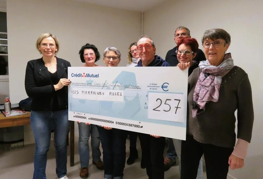 La troupe de théâtre précignéenne L’Échancrure a remis un chèque à l’association solesmienne les Marraines Roses, engagée dans la lutte contre le cancer du sein.