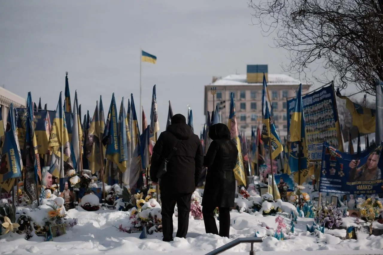 Des personnes se recueillent devant un mémorial pour les soldats ukrainiens tués, à Kiev, le 19 février 2026. © HIROTO SEKIGUCHI / The Yomiuri Shimbun via AFP