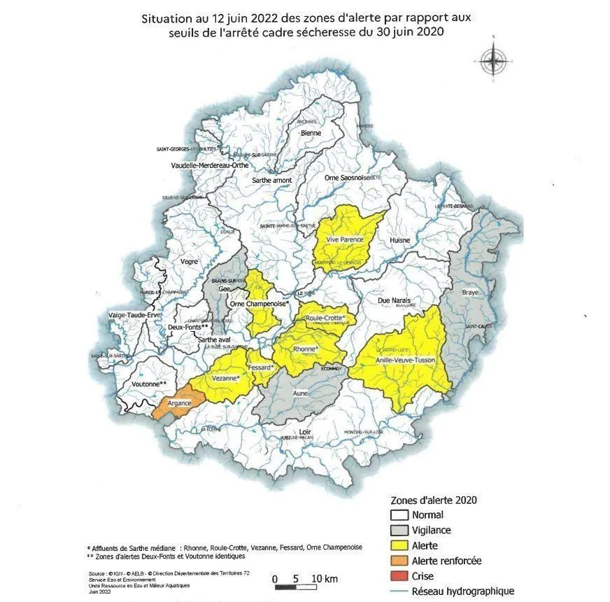 Le bassin-versant de l’Argance (Le Bailleul, Crosmières, Arthezé, Villaines-sous-Malicorne ou encore La Chapelle-d’Aligné) est le secteur le plus touché (en orange sur la carte ci-dessous). Placé en alerte renforcée, dernier niveau avant la « crise », il doit bénéficier de l’attention des particuliers et des collectivités.