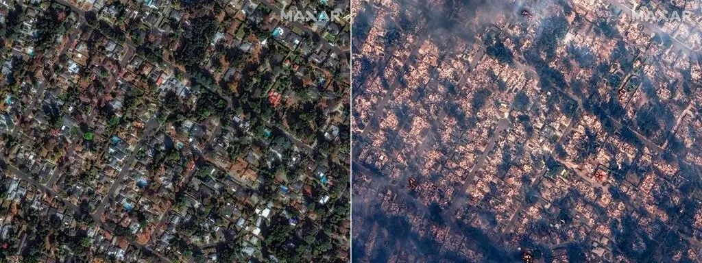 Cette combinaison d’images satellites de Maxar Technologies créées le 8 janvier 2025 montre une vue d’un quartier d’Altadena, en Californie, le 6 janvier 2025 (à gauche) et le 8 janvier 2025 lors de l’incendie d’Eaton. AFP / SATELLITE IMAGE ©2025 MAXAR TECHNOLOGIE